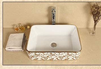 Art Ceramic Bathroom Sink Above Counter/Vessel Sink Bowl/Wash Basin Vanity Sink in Rectangle shape Countertop for Lavatory 475 x 365 x 130 MM (Gold White Floral Pattern) ....